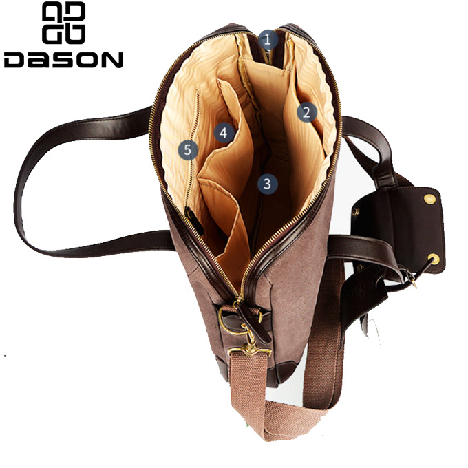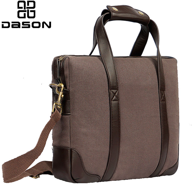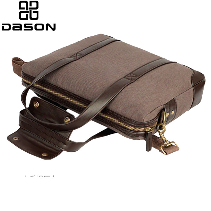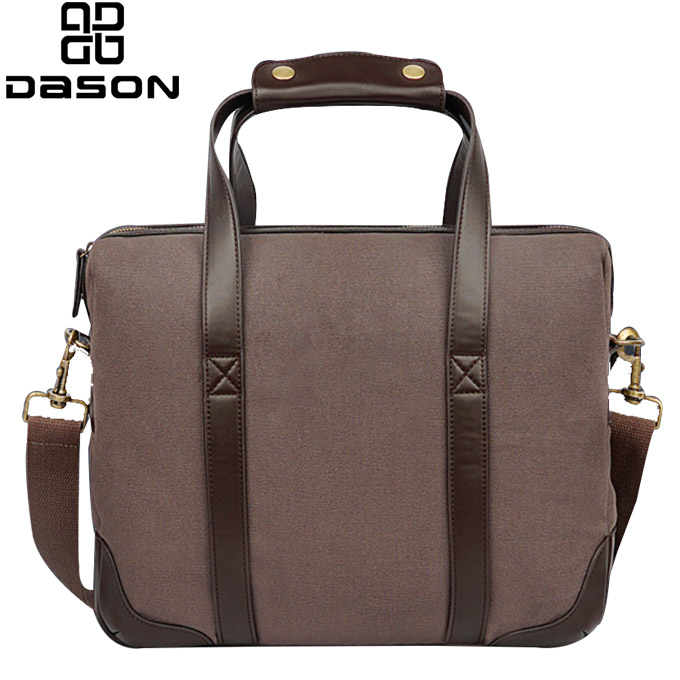 Dizajn plátenej tašky na laptop s klasickou koženou rukoväťou a nylonovým ramenným popruhom s bronzovým háčikom a prackami